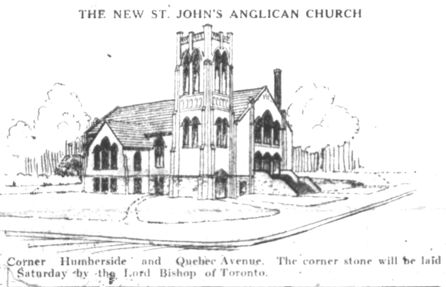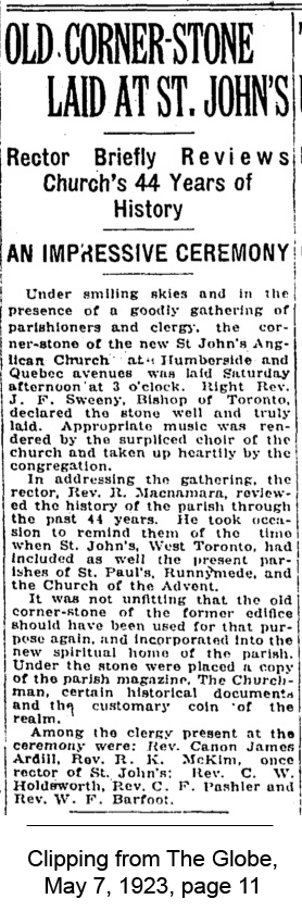 This weekend, members of St. John’s Anglican Church, West Toronto, along with those who share its building and many in the neighborhood who enjoy it, are celebrating the centennial of the laying of the cornerstone for its Humberside home. The cornerstone was laid on Saturday, May 5, 1923.