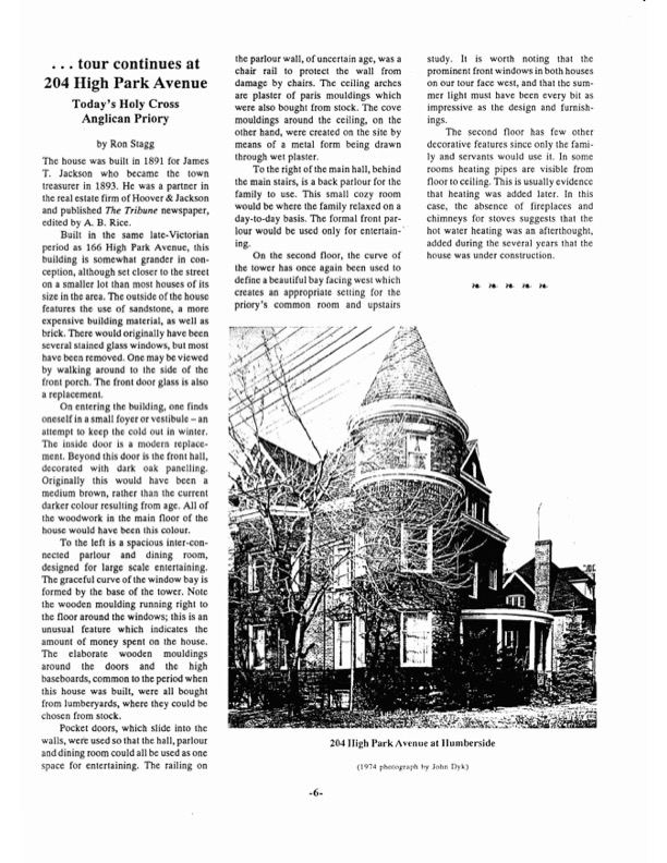 Article about history and features of 204 High Park Ave. from “The Leader & Recorder” journal of the West Toronto Junction Historical Society, Nov-Dec 1991.